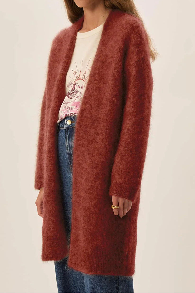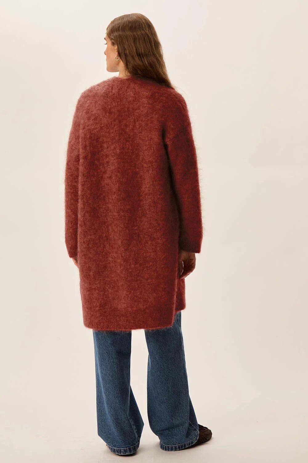 "Alfa" ist ein zeitloses und vielseitiges Teil für die kalten Tage. Die lange Strickjacke hat einen geraden Schnitt, lange Ärmel und leicht versetzte Armlöcher und dank der Kid Mohair & Merinowollmischung kannst kann sich wunderbar in den Cardigan einkuscheln.