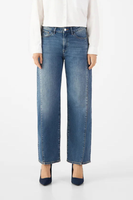 Die "Ash" ist eine Barrel-Leg Jeans im klassischen 5-Pocket-Stil. Mittelhoch zwischen Taille und Hüfte. Weit an den Oberschenkeln, zum Saum hin schmaler werdend mit leicht O-förmiger Silhouette.