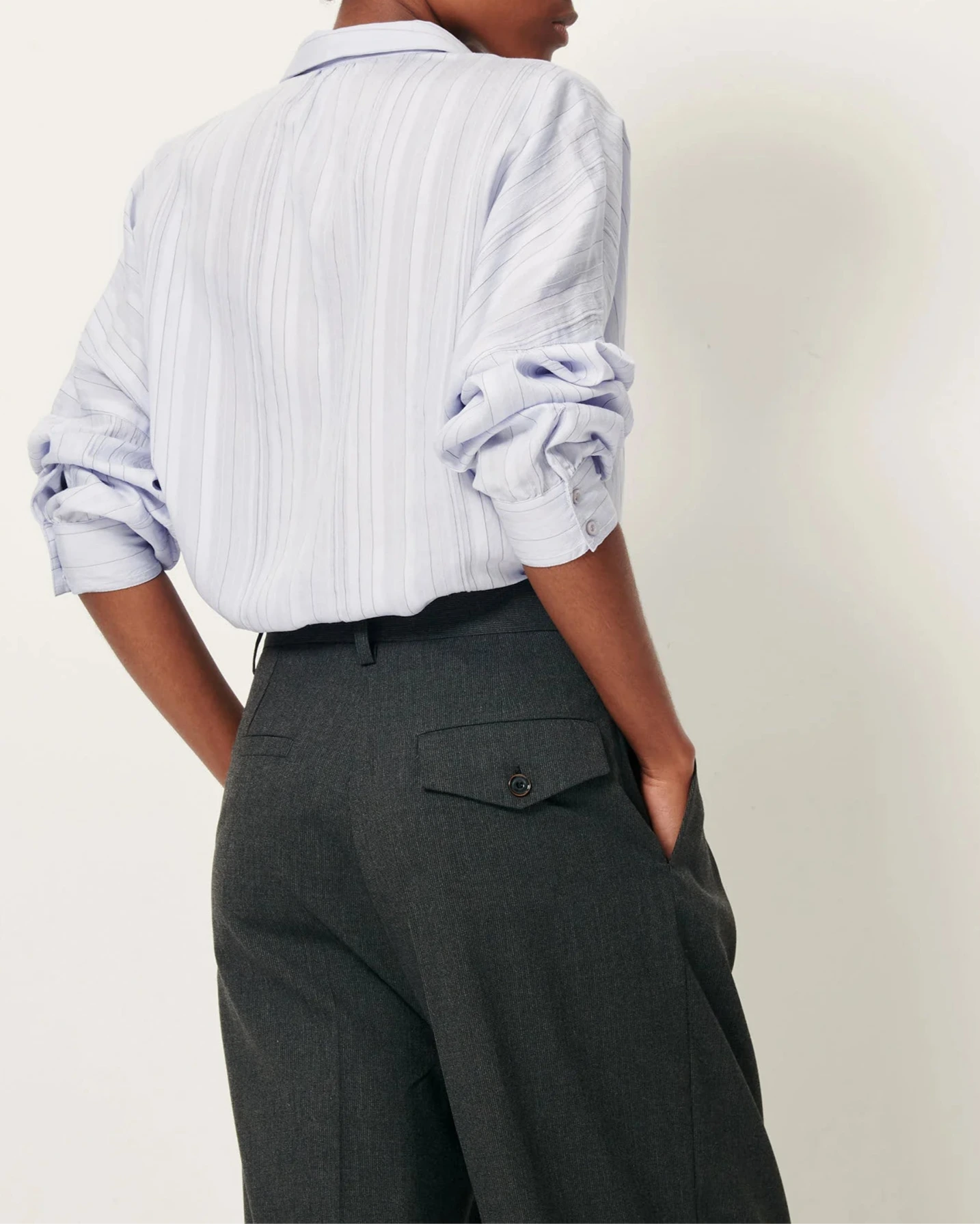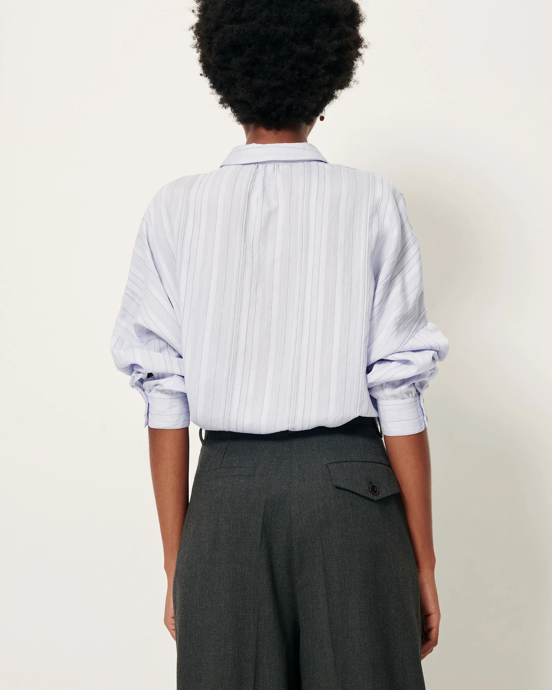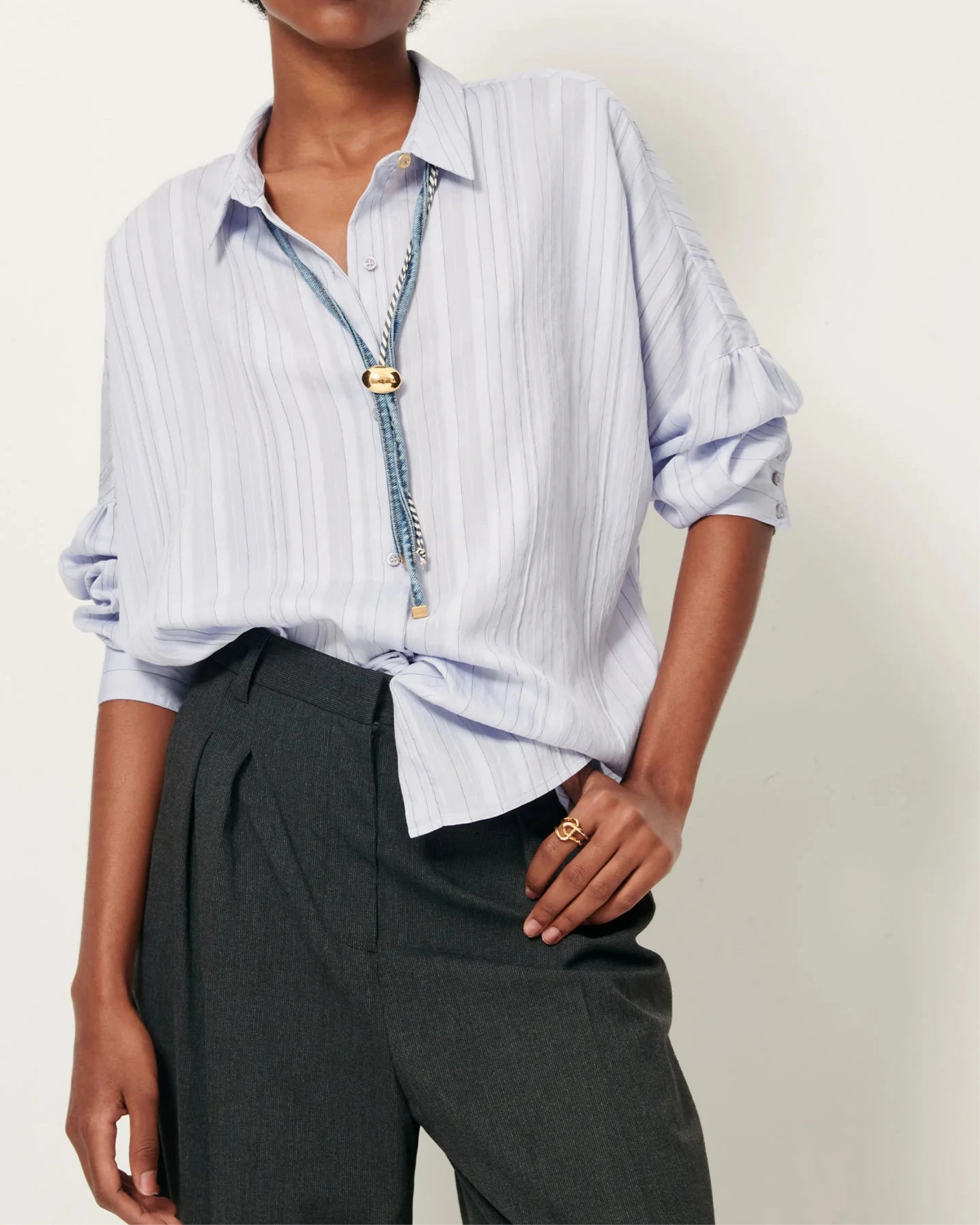 Das "Botan"-Hemd ist locker geschnitten und hat tief angesetzte, geraffte Armlöcher aus leichtem Viskoseperkal mit Dobby-Streifen.