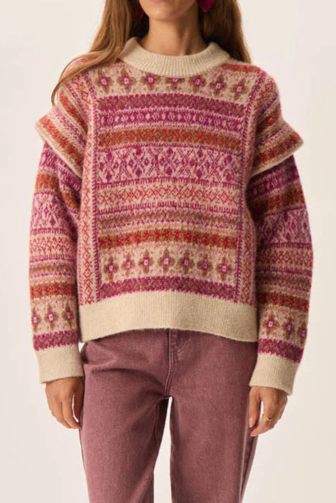 Mit seinem kastenförmigen Schnitt, den grafischen Ärmeln und dem hypnotischen Jacquard wird der Pullover "Coco" zum absoluten Schmuckstück. Der Langarmpullover hat einen geraden Schnitt, einen hohen Kragen, versetzte Armausschnitte mit flossenartiger Passe am Oberarm. Die gerippten Abschlüsse runden das Ganze wunderbar ab.