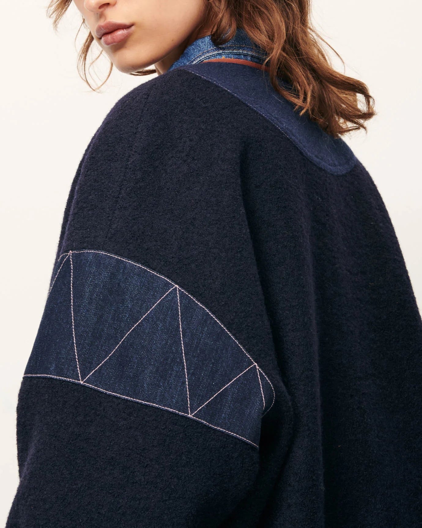 Die rund geschnittene Jacke "Cold Night" aus gekochter Wolle hat Einsätze aus Denim und kontrastierende Steppnähte. Die Knopfleiste mit Druckknöpfen verdeckt ein Stück des Reißverschlusses. Die Paspeltaschen mit abgesteppten Patten mit Druckknöpfen machen die Jacke zu einem wunderschönen Sessùn-Schmuckstück.