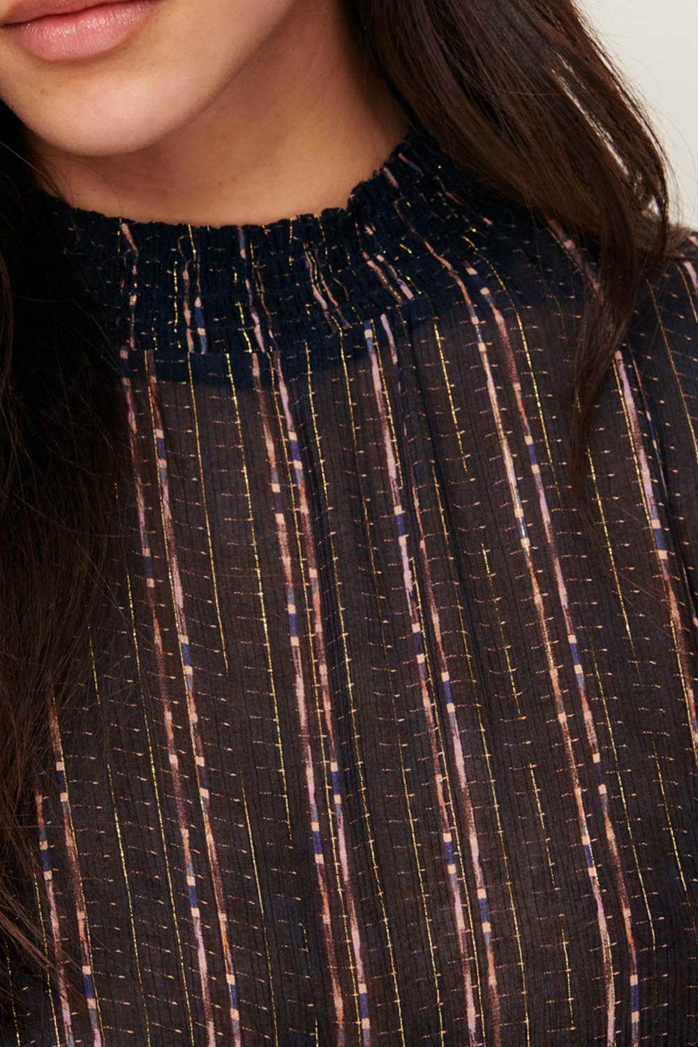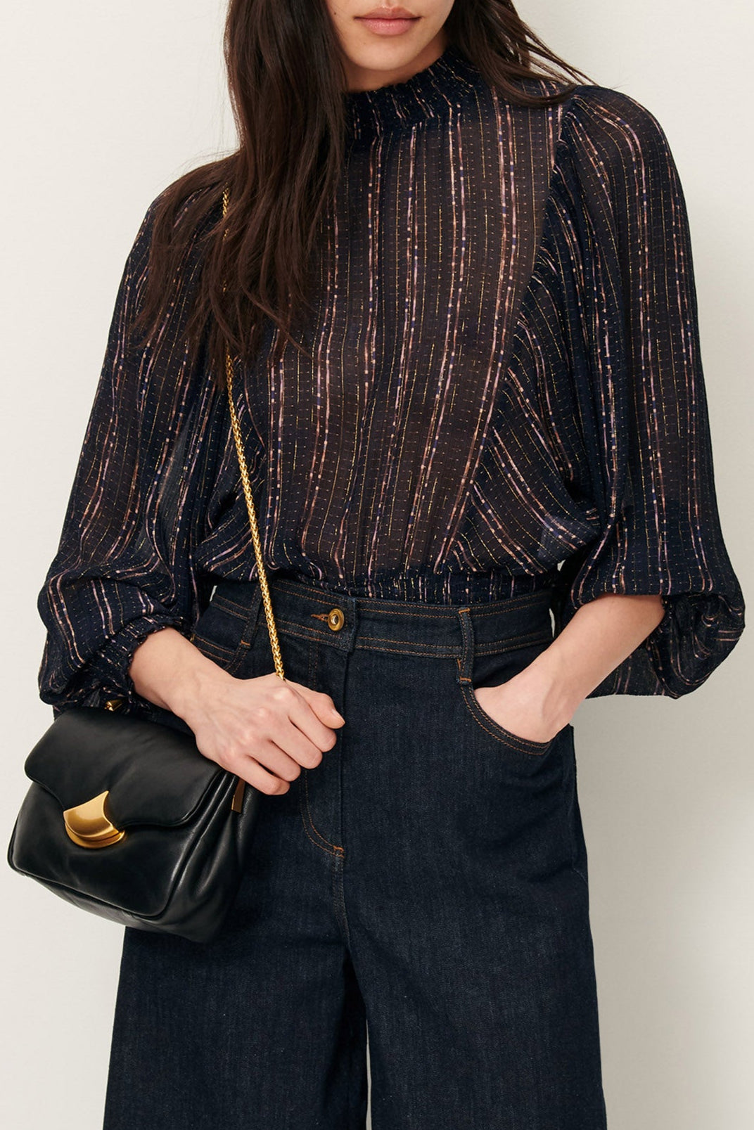 Die "Duchess"-Bluse ist mit ihren Ballonärmeln aus bedrucktem Krepon aus Musselinseide und Viskose mit zarten Metallic-Streifen ein wunderschönes Schmuckstück. An den Ballonärmeln sind elastische Bündchen und am Rücken liegt ein Knopfverschluss mit Schmuckknöpfen.