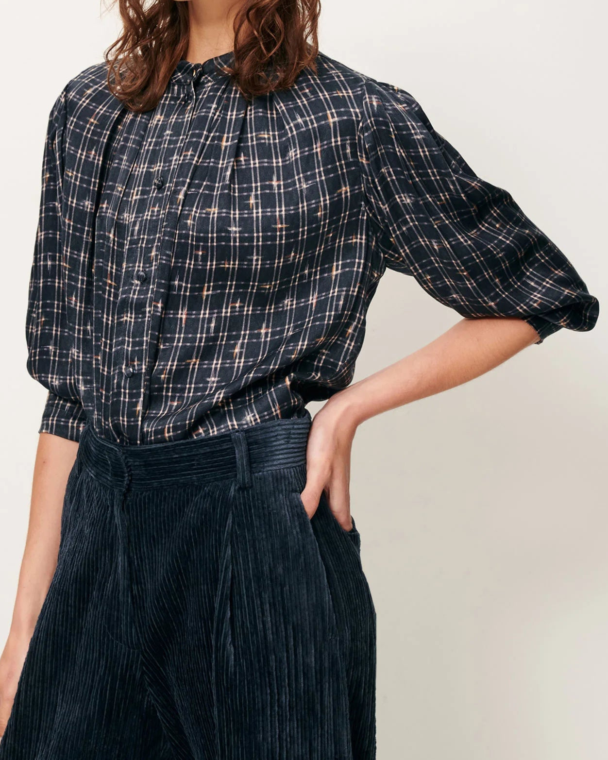 "Esperanzo" ist eine figurbetonte Faltenbluse aus einem wunderbar leichten, satinierten Chiffon mit einem exklusiven Sessùn-Muster. Sie hat einen Rundhalsausschnitt, einen Knopfverschluss vorne mit Schmuckknopf am Kragenfuß, lange Ärmel mit Liegefalten und Schmuckknöpfen an den Ärmelabschlüssen. Die Kellerfalten auf Vorder- und Rückseite machen die Bluse komplett.