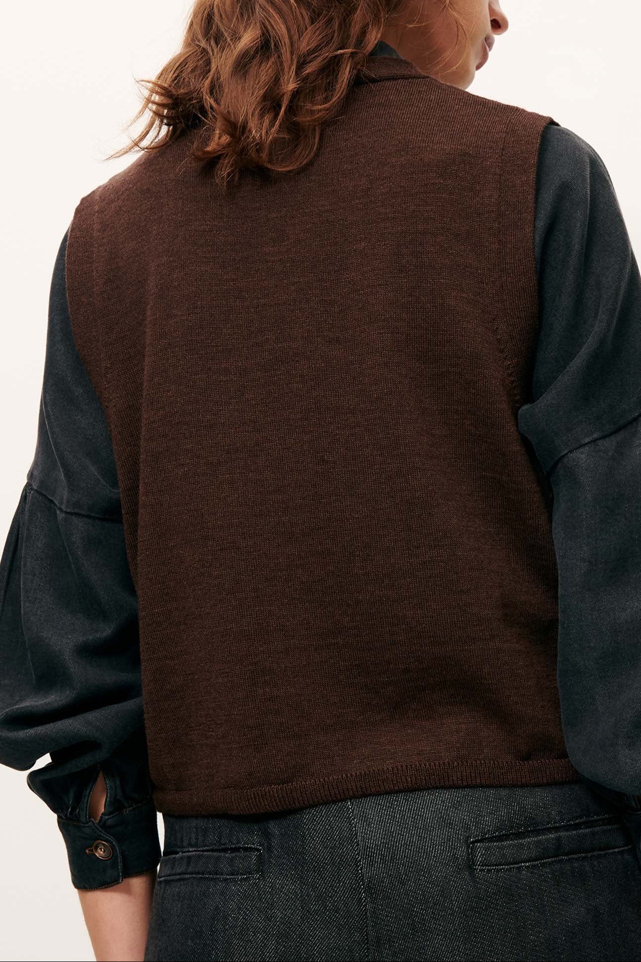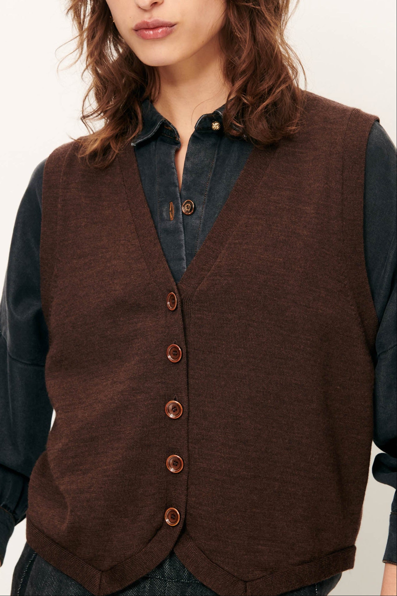 "Giancarlo" ist eine ärmellose, vorn geknöpfte Weste aus feinem Merinostrick in Jersey-Optik mit V-Ausschnitt. Wunderschön alleine, über eine Bluse oder ein Longsleeve.