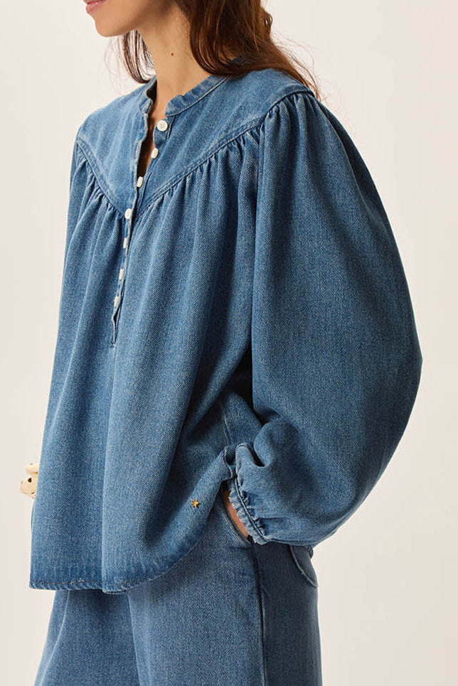 Die Jeansbluse "Laura" vereint Stil und Komfort. Die Knopfleiste vorne, die Schulterausschnitte, die lockere Passform und die Ballonärmel mit enger Manschette machen dieses Stück perfekt für den Herbstanfang.