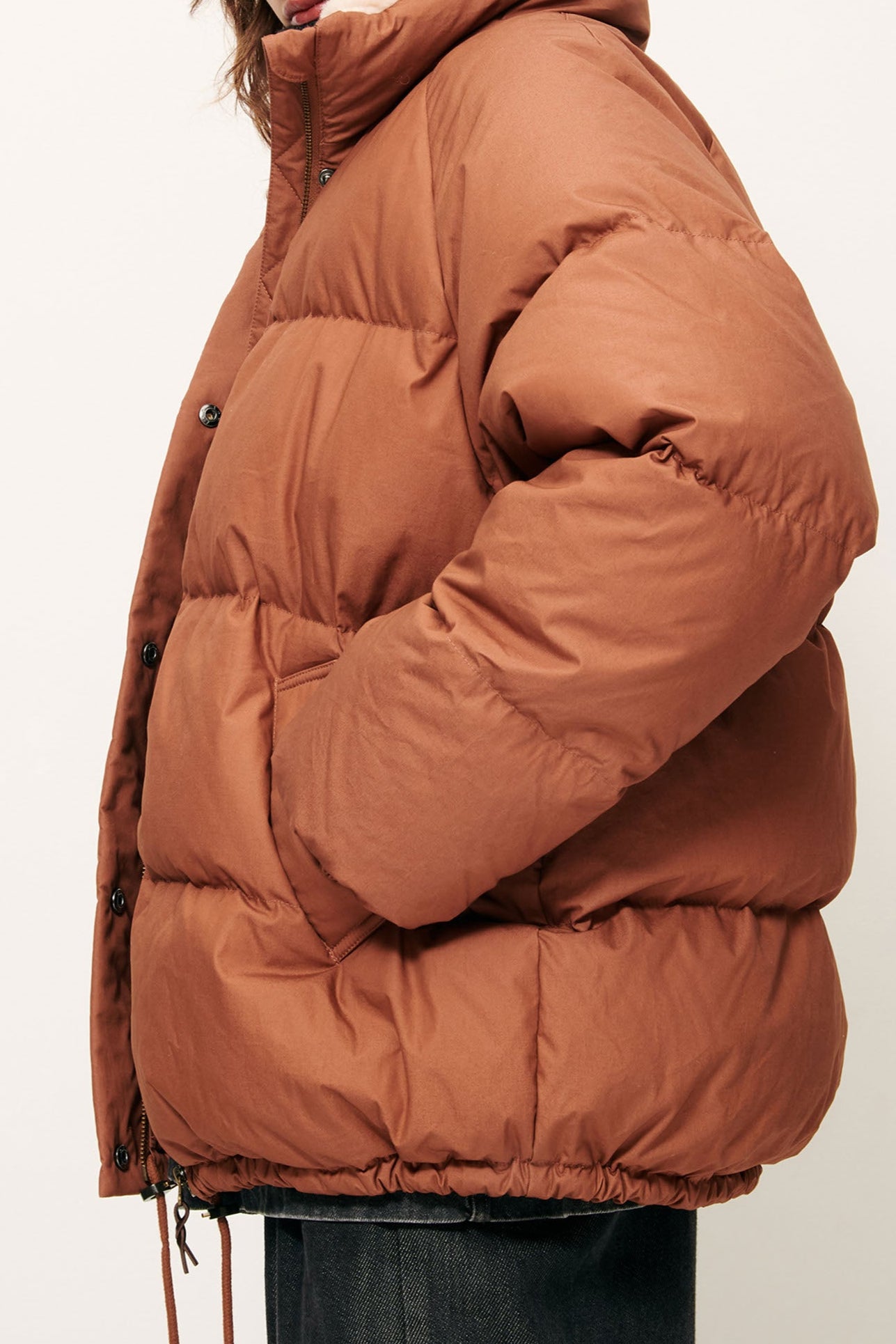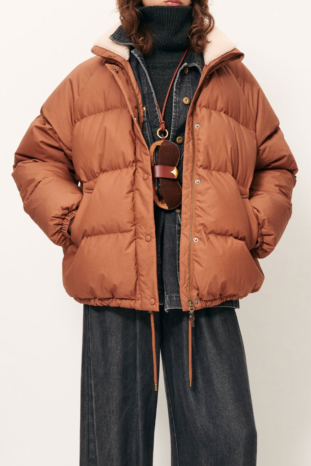 Die "Livingstone" ist eine leicht übergroße, wattierte Jacke mit hohem Kragen aus Schaffell-Imitat in wasserabweisendem, kompaktem Baumwollgewebe, gefüttert mit Federn und Daunen aus zertifizierter natürlicher Herkunft.