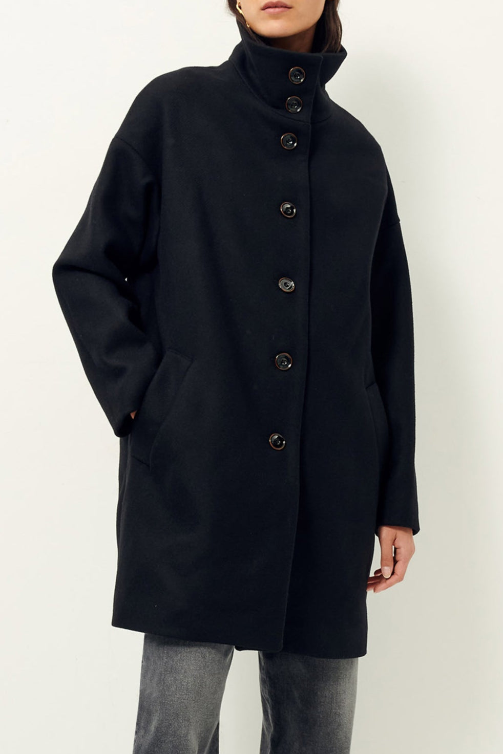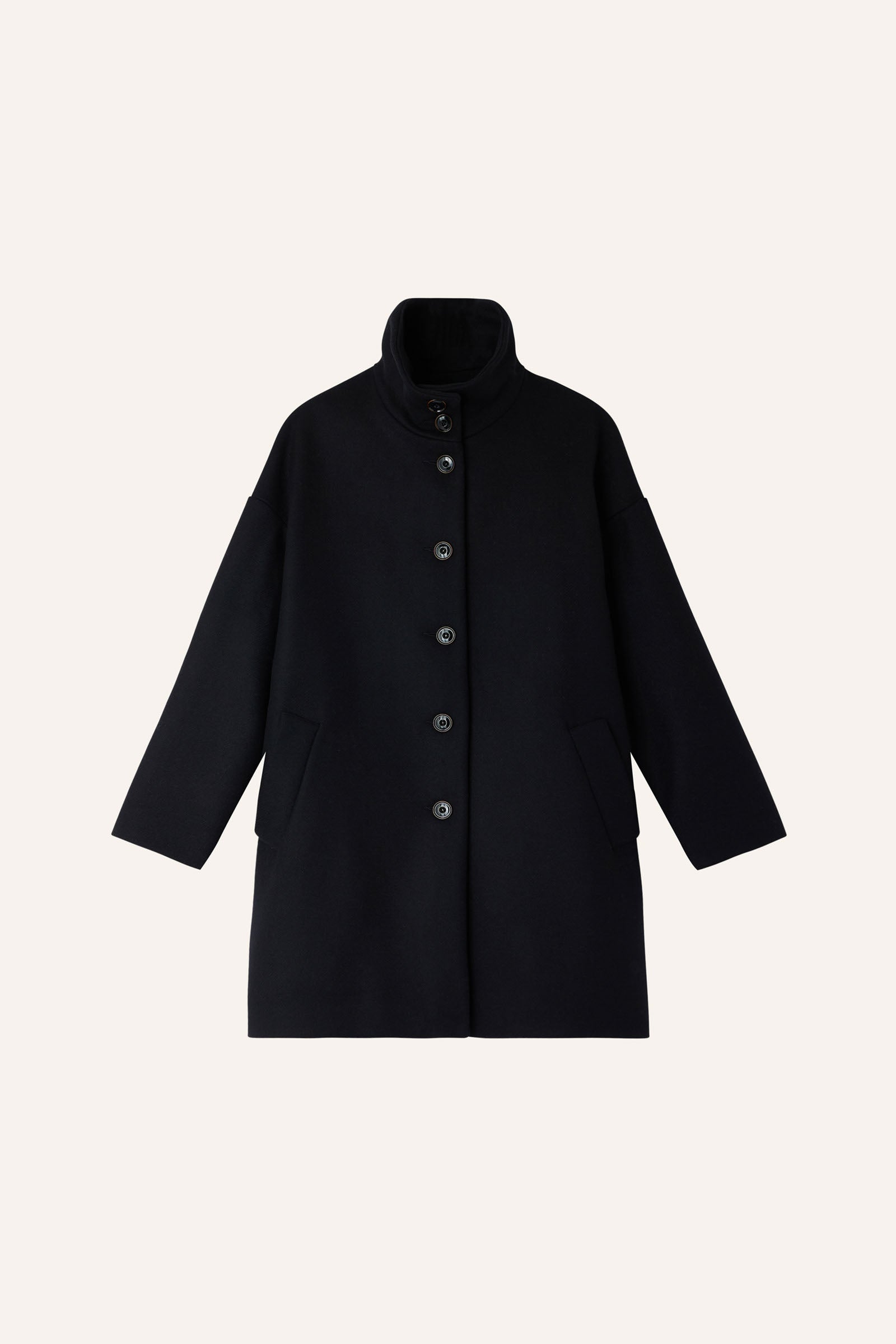 "Paradise" ist ein gerade geschnittener, leicht oversized Kurzmantel mit Stehkragen aus doppelt gewebtem Serge. Die Armlöcher sind tief angesetzt.