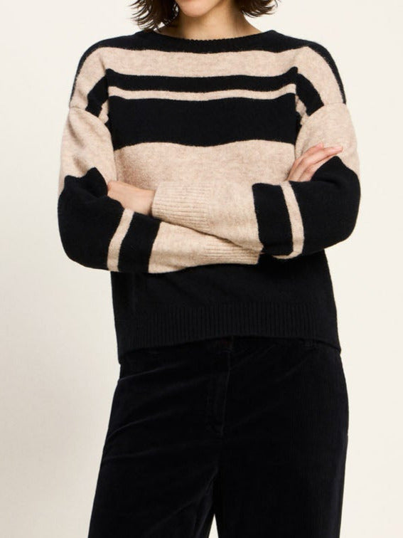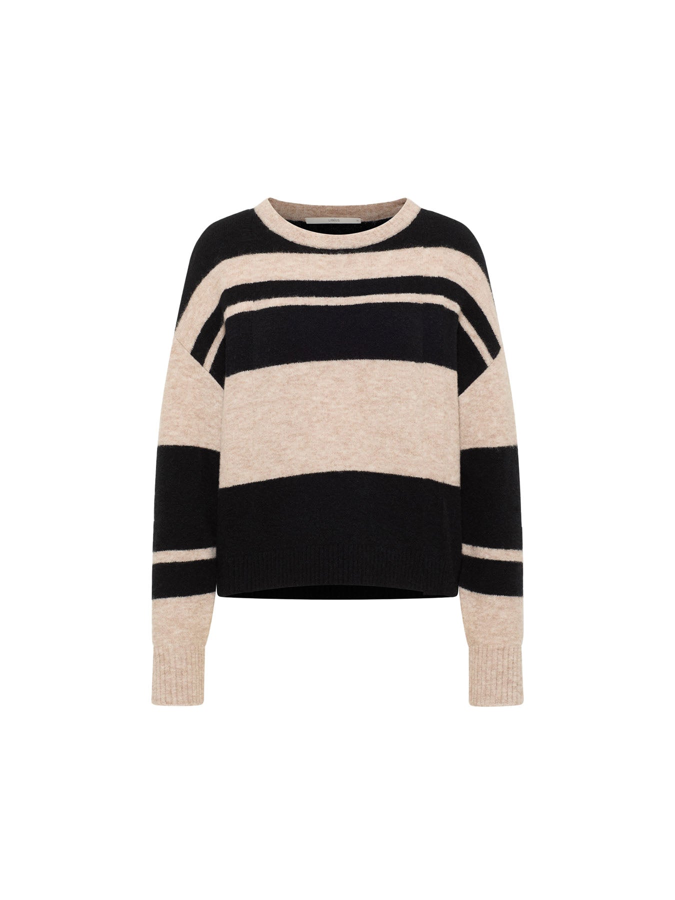 Der Lanius Streifenpullover vereint zeitloses Design mit nachhaltiger Qualität. Hergestellt aus Bio-Schurwolle, Bio-Alpakawolle und Bio-Baumwolle, bietet er ein weiches Tragegefühl und hält angenehm warm. Mit seinem lockeren Oversize-Schnitt, den überschnittenen Schultern und dem modernen Streifenmuster ist er ein echtes Lieblingsstück für Herbst und Winter.