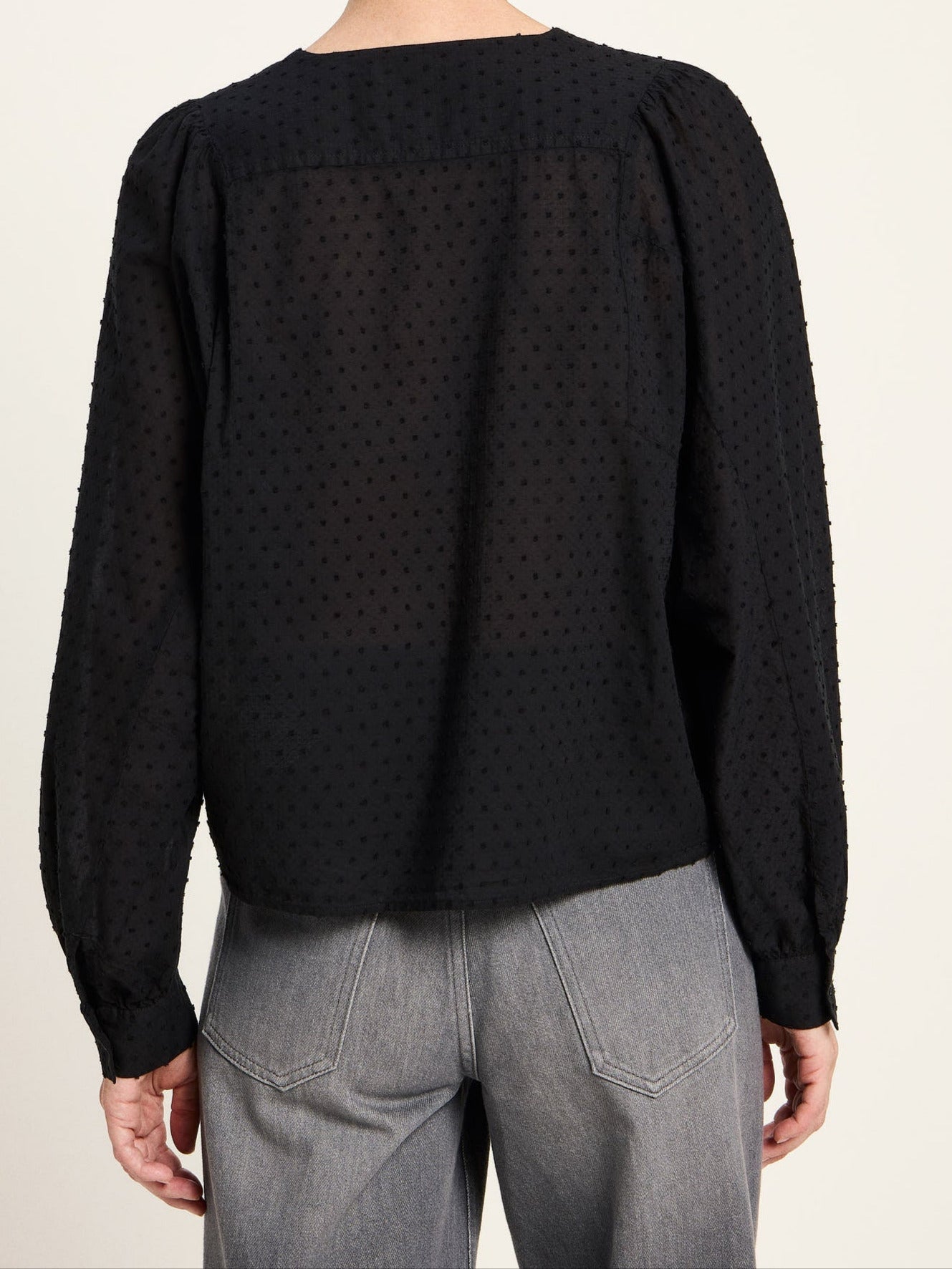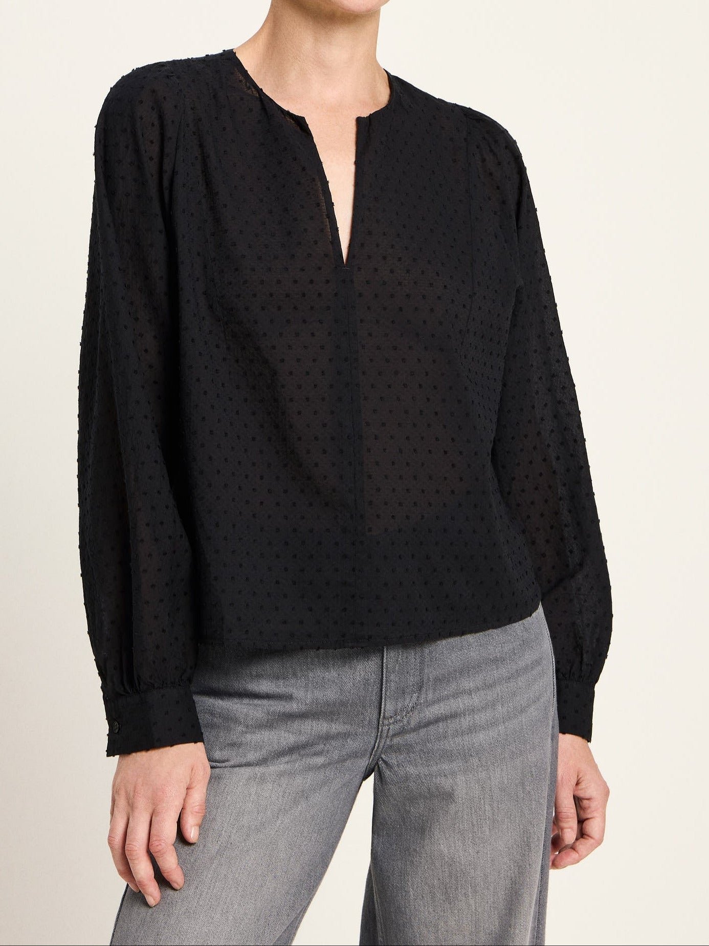 Die Strukturbluse aus veganer Bio-Baumwolle bringt durch die Ton-in-Ton-Noppen und zarte Kräuseldetails feminine Leichtigkeit in den Alltag. Der weite, fließende Schnitt trifft auf weich geraffte Schultern und Ärmel, ein dezenter V-Ausschnitt rundet den modernen Look ab. Die leicht transparente Baumwollqualität wirkt edel – ideal für bewusste Outfits mit besonderer Struktur, ob zur Jeans, zur Culotte oder unter feinem Strick.