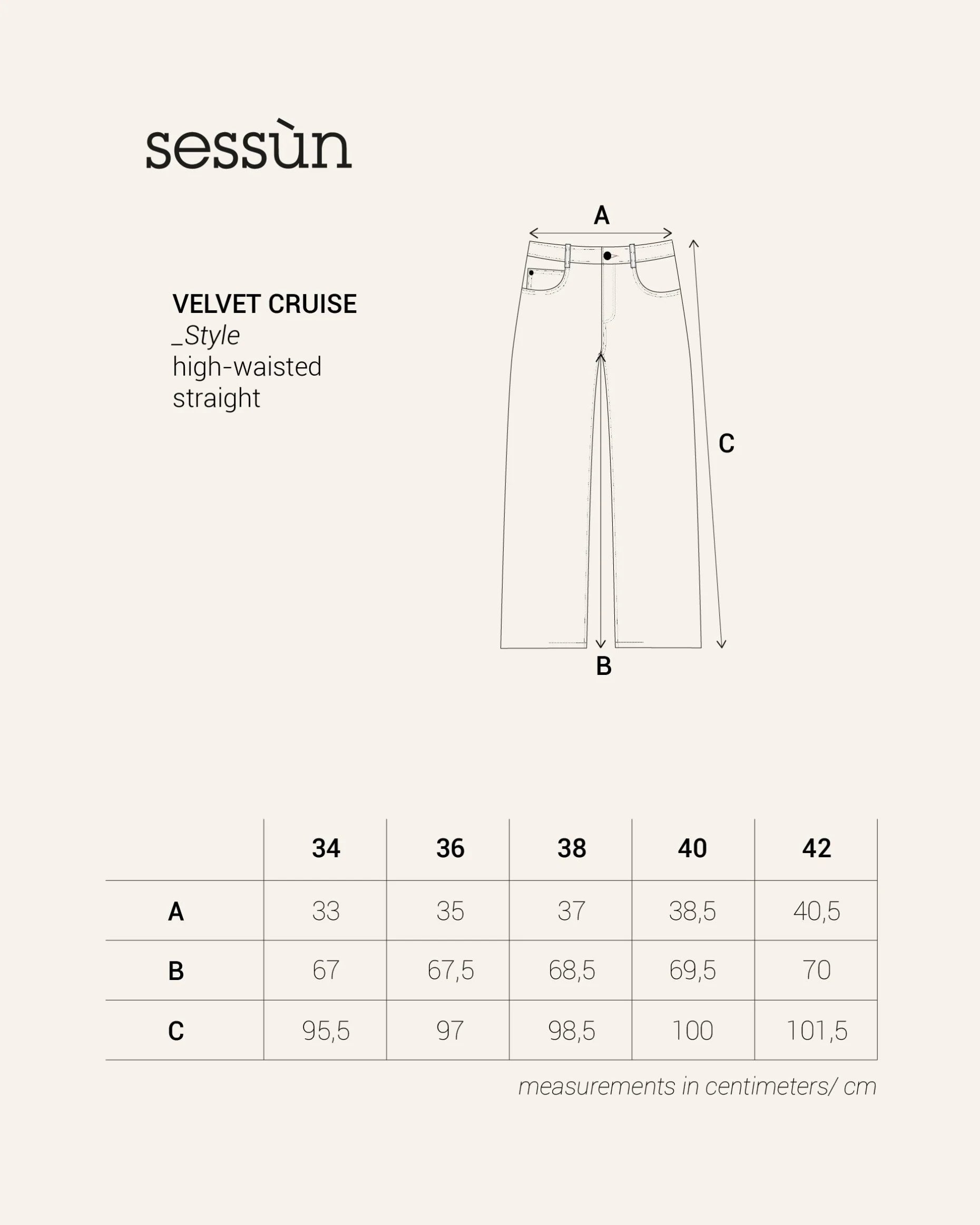 Die "Velvet Cruise" ist eine gerade geschnittene Hose mit 5 Taschen und hohem Bund aus pigmentgefärbtem Feincord. Sie hat ein etwas verkürztes Bein und sitzt dank etwas Stretch super bequem.